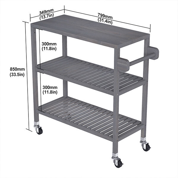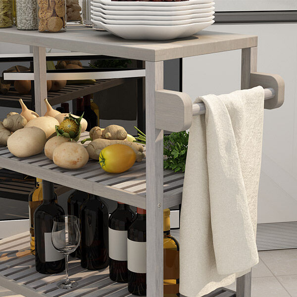 İki açık raf, çeşitli mutfak eşyaları veya cihazlar için harika bir depolama alanı sağlar. Arabanın bir ucunda, arabayı hareket ettirirken rahat bir tutuş sağlayan bir havlu rafı bulunur.