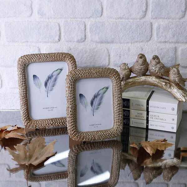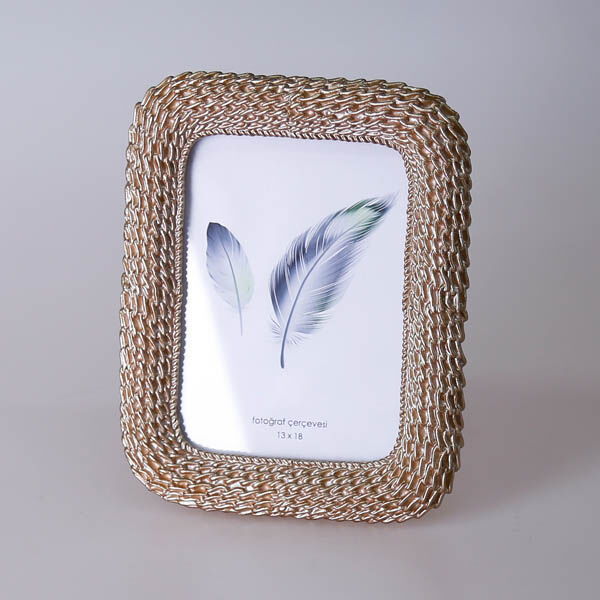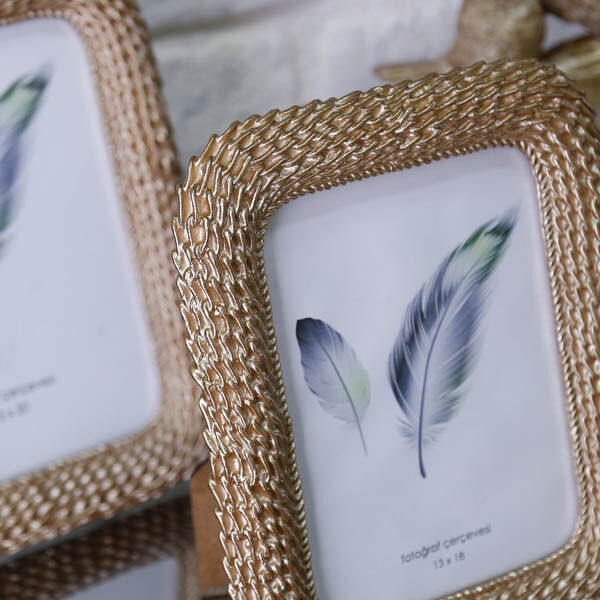 Genel Bakış; Fotoğraf çerçevelerinin küçüklü büyüklü dekorasyondaki yeri çok başkadır. En sevdiğiniz ve hep göz önünde olmasını istediğiniz hatıralarınızı, yeni gözdemiz zincir görünümlü Chain çerçevenin ışıltılı altın rengi iki boyunu alarak kombin yapabilir, evinize ufak bir yenilik katabilirsiniz. Ürün Bakımı; Kuru ve nemli bez ile temizleyiniz. Ürün Özellikleri; Malzeme : Reçine Marka : Selim Menşei : Türkiye Boyutlar ve Ağırlıklar; (cm / gr) Genel boyutları E:18 B:23 Y:2,5 A: 532 Fotoğraf boyutu E:13 B:18