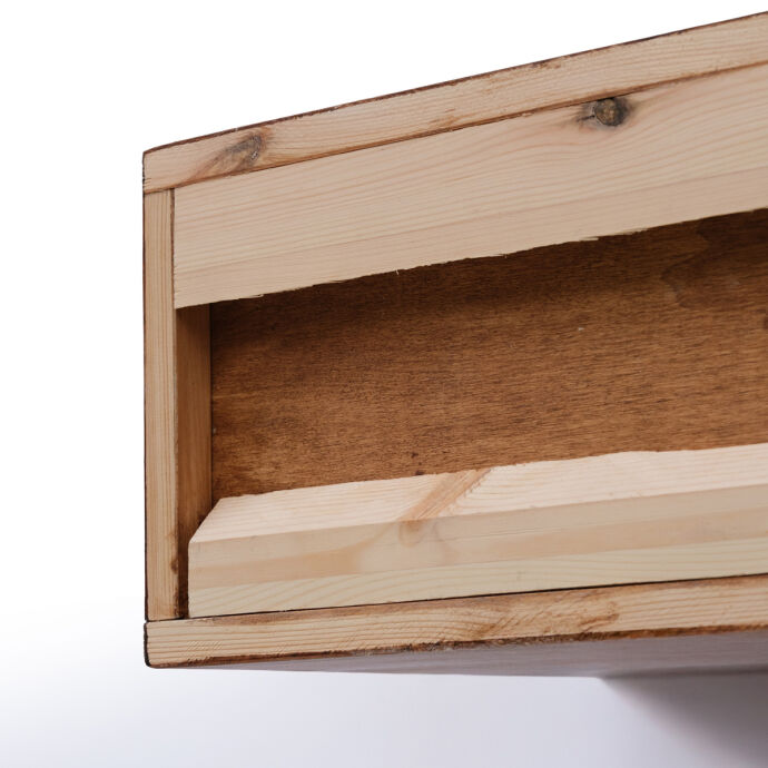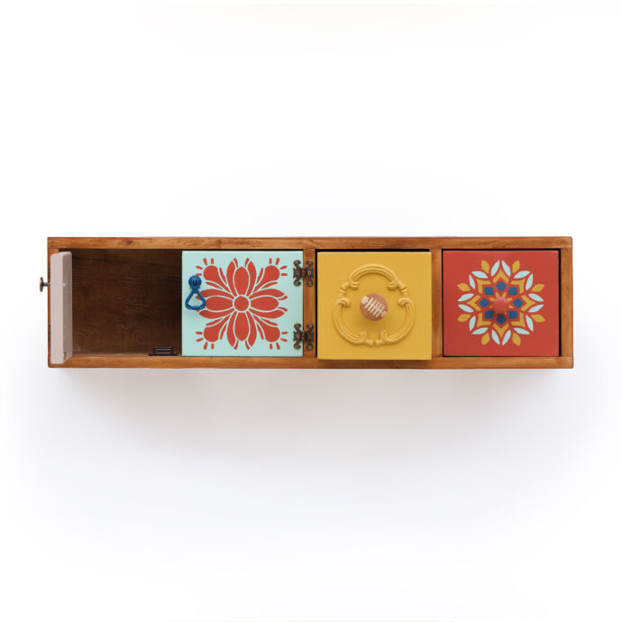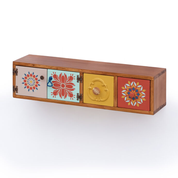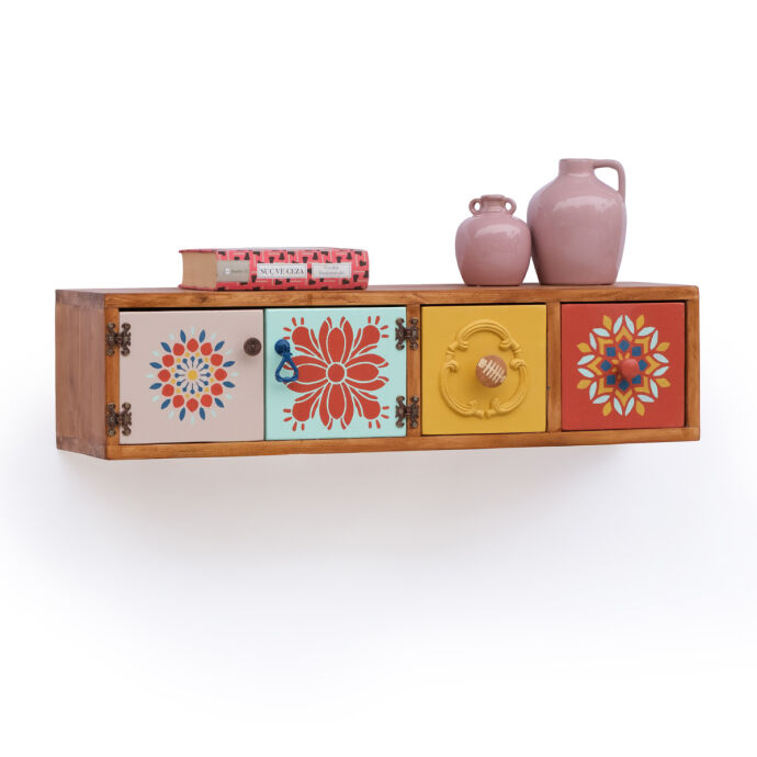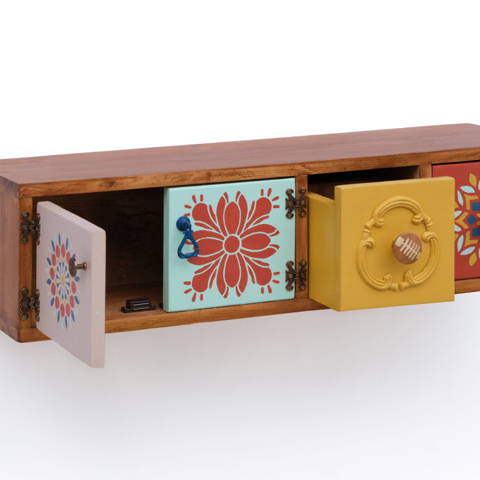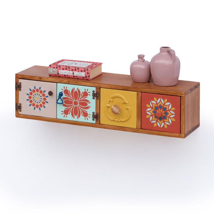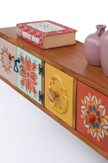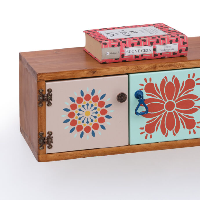 Tamamı masif ahşaptan üretilen bu duvara monte dresuar,el boyaması kapak ve çekmece detaylarıyla bulunduğu ortama sanatsal bir karakter kazandırır.İki çekmece ve aynı alana açılan çift kapaklı bölmesi sayesinde hem dekoratif hem fonksiyonel bir depolama alanı sunar.