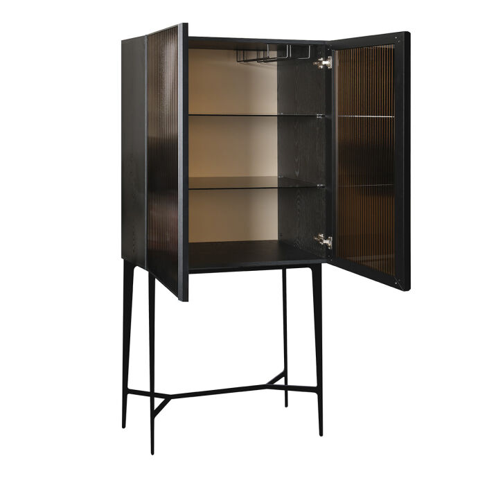 - Bronz camdan iki adet rafı vardır. Cam kalınlıkları 6 mm’dir. Büfenin ayağı metal üzerine siyah ince pütürlü boya uygulanarak üretilmiştir.