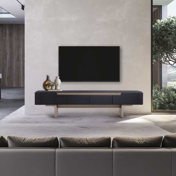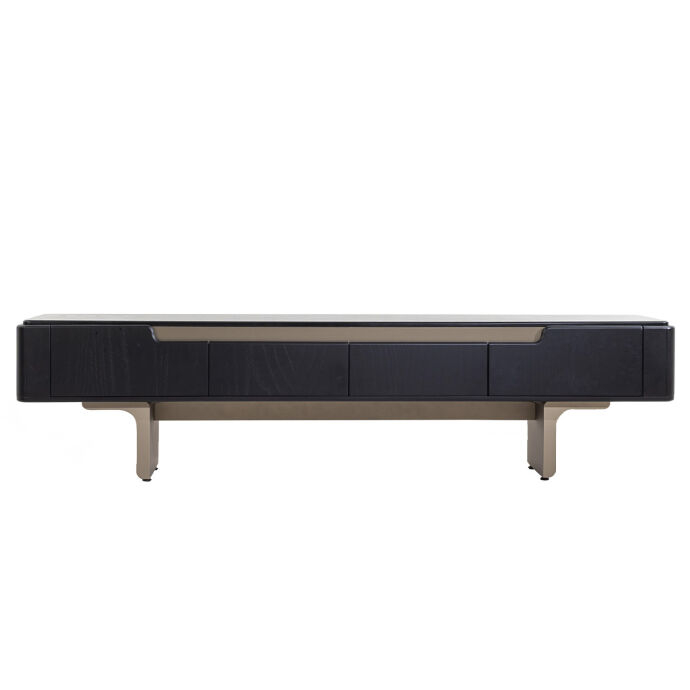 Tv gövdesi, meşe kaplama üzerine siyah lake ile hareleri kaybetmeden boyanmıştır. Ayaklar, metalik lake ile boyanmıştır.