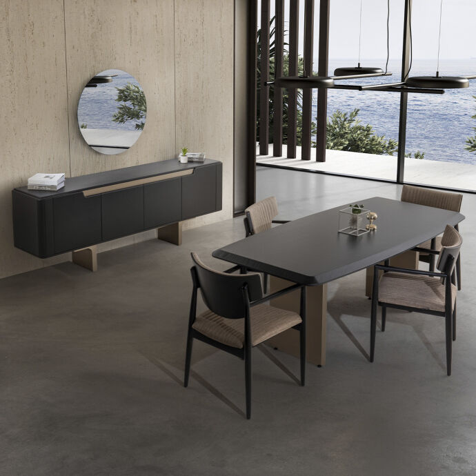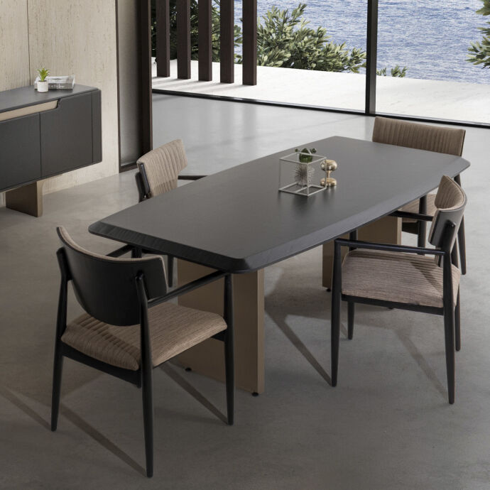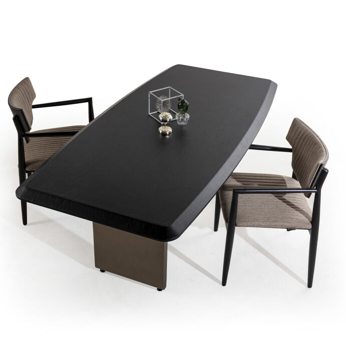 Masa üst tabla, meşe kaplama sıvanarak üzerine siyah lake ile hareleri kaybetmeden boyanmıştır. Ayaklar, metalik lake ile boyanmıştır.