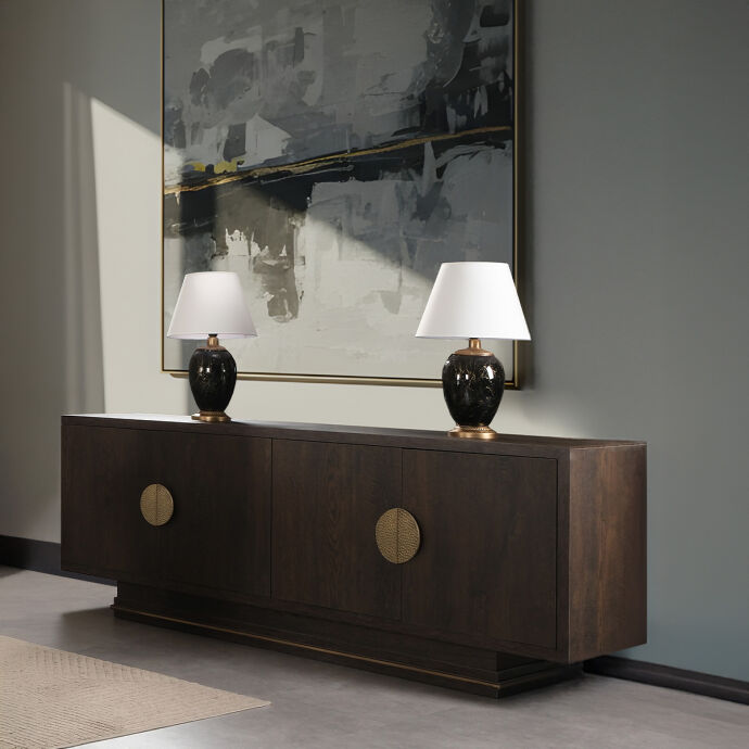 Konsol bazalarındaki pirinç çubuk ve özel el işçiliği ile boyanmış metal kulpları takıma sade ve şık bir görünüm kazandırmıştır.