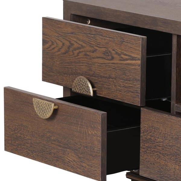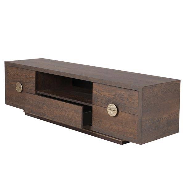 TV ünitesi bazalarındaki pirinç çubuk ve özel el işçiliği ile boyanmış metal kulpları takıma sade ve şık bir görünüm kazandırmıştır.