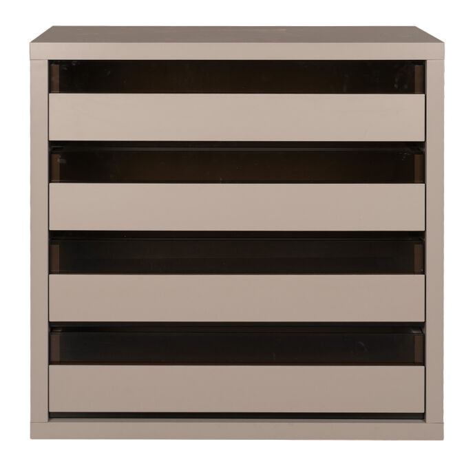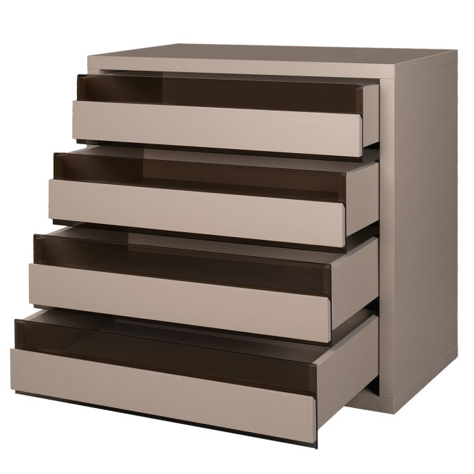Camlı şifonyer modülü hem 90lık gövde modül içerisinde hem de modül dışında şifonyer olarak kullanım alanı sağlamaktadır. Dört çekmeceli olup gövde tamamen yonga levha panel malzemeyken çekmece klapalarında temperli bronz cam kullanılmıştır